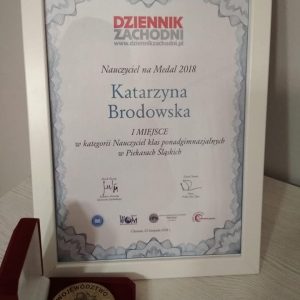 Jesteśmy bardzo dumni ponieważ nasza Pani wicedyrektor Katarzyna Brodowska w dniu dzisiejszym odebrała medal i dyplom za zajęcie I miejsca w konkursie „Nauczyciel na medal” w Piekarach Śląskich w kategorii szkoły ponadgimnazjalne. Duma to nie jedyne uczucie ponieważ wszyscy jesteśmy pewni, że Pani wicedyrektor jak mało kto zasługuje na wyróżnienia i nagrody. Dziękujemy za to że jest Pani z nami.