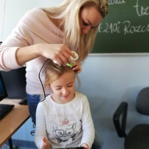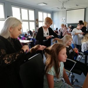 Dzieci mogły dowiedzieć się, jak przeprowadza się diagnozę skóry głowy i włosów z użyciem mikrokamery, rysowały – projektowały fryzury oraz same próbowały swych sił w przygotowywaniu fryzur na główkach ćwiczeniowych. Uczniowie szkoły podstawowej zostali pięknie uczesani przez przyszłe fryzjerki z naszej szkoły, a także zapoznali się z literaturą fachową.